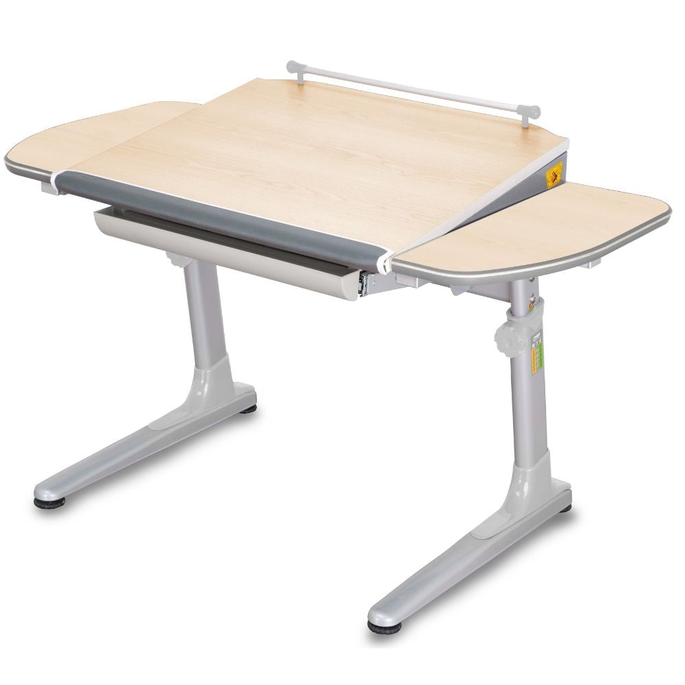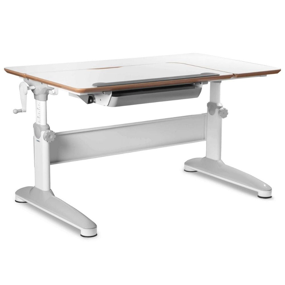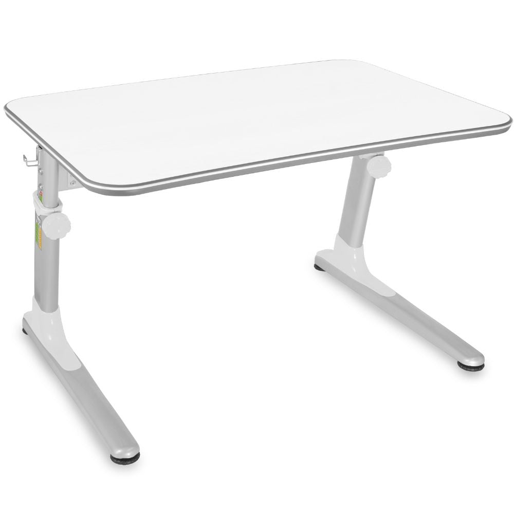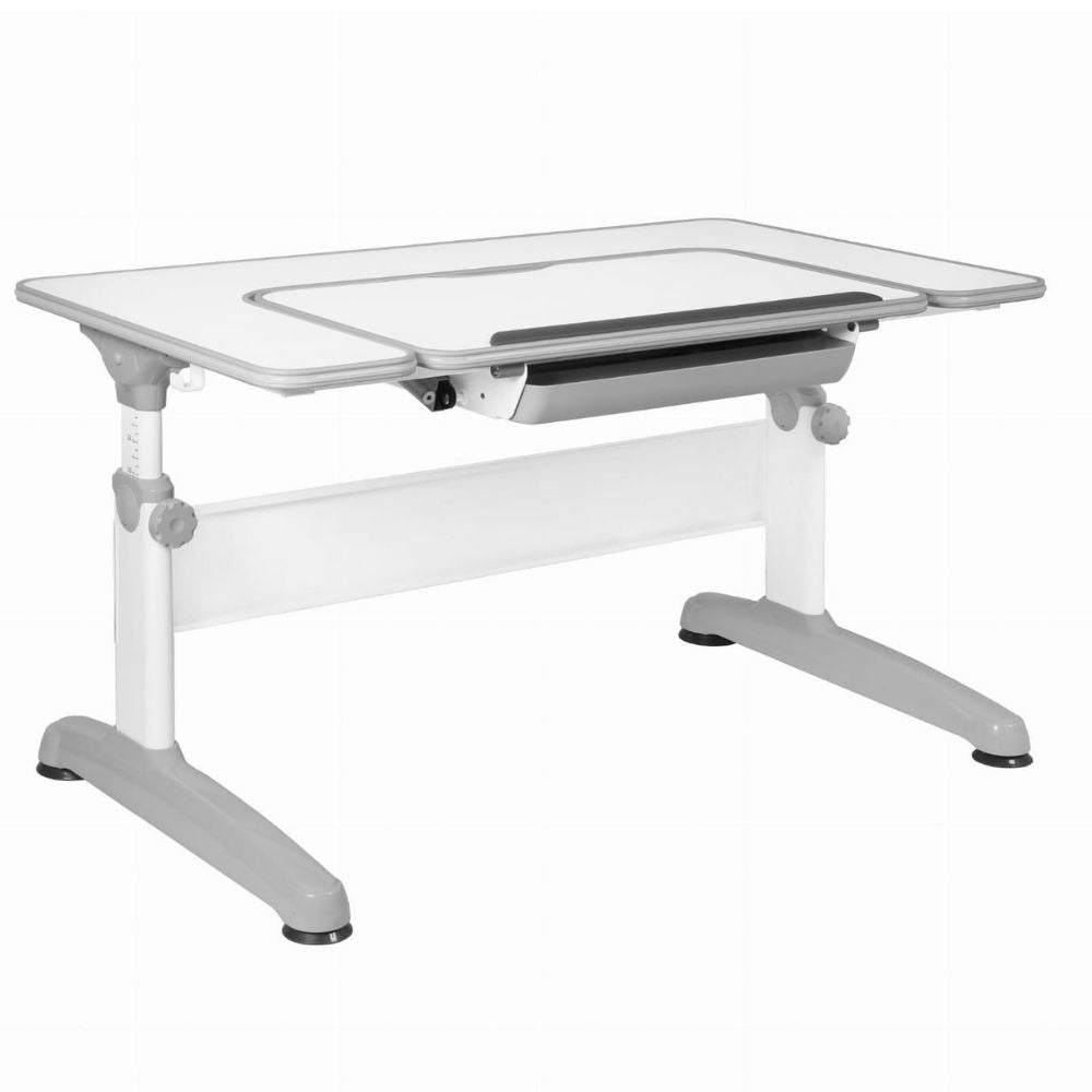 Jeden z popularnych modeli biurek dziecięcych to model Uniq marki MAYER. Dostosujesz wysokość blatu w zakresie 55-80 cm (ta maksymalna wysokość do wzrostu nawet 195 cm). Część środkowa blatu posiada opcję nachylenia 36 stopni i blokady aż w 6 pozycjach. Pozwoli to dostosować nachylenie do potrzeb użytkownika. Zdrowe biurko dla Twojego dziecka Mayer Uniq posiada obszerny blat z zaokrąglonymi rogami wykonany z wysokiej jakości płyty laminowanej - 120 x 70 cm. To, że biurko posiada zaokrąglone krawędzie to ważne. Ograniczmy w ten sposób ryzyko urazów dziecka. Biurko wyposażone jest w szufladę z organizerem na dokumenty i przybory szkolne w standardzie, przez co zadba o porządek. Biała kolorystyka z szarymi elementami pozwoli wpasować biurko do każdego pokoju dziecięcego.